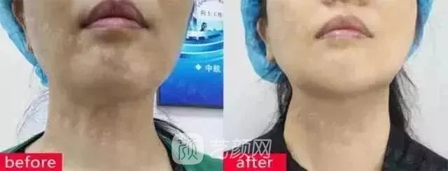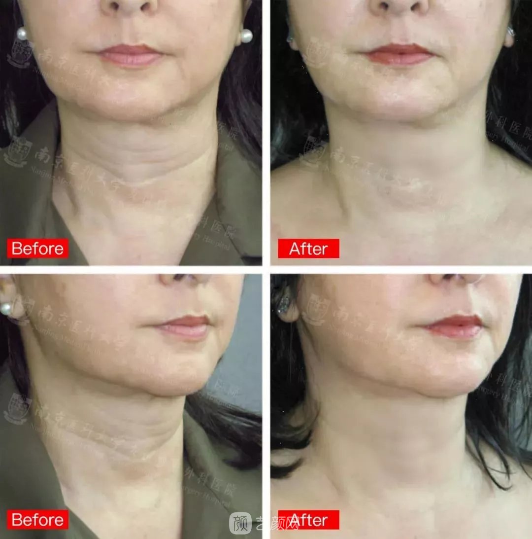 美姐早期頸部多頸紋并且由于年齡原因?qū)е孪掳图跋骂M處肌肉松弛,進(jìn)行了一次娜芙蒂蒂微滴注射后果: