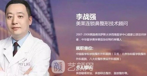 李戰(zhàn)強:副主任醫(yī)師,美萊特聘鼻整形技術(shù)總監(jiān),生于醫(yī)學世家,碩士畢業(yè)于第四軍醫(yī)大學醫(yī)學美容專業(yè),曾去美國得克薩斯大學西南醫(yī)學中心進修,并師從鼻整形大師,PRS雜志主編Rod J. Rohrich教授,近二十年專注鼻部外科整形,常赴韓國、美國深入交流,備受同行推崇。